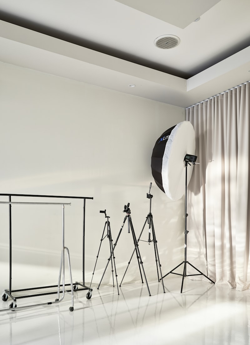 - Backdrop system — seamless paper rolls and muslin backdrops for clean, controlled backgrounds